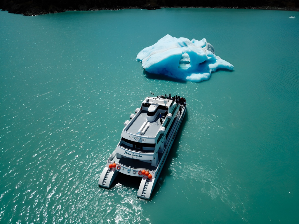 Aquí se silencian los motores del Crucero María Turquesa y se realiza una interesante caminata coordinada por el equipo de guías. Una vez de regreso en la embarcación, la excursión continúa navegando hacia el Glaciar Perito Moreno mientras se ofrece el almuerzo gourmet abordo o la vianda gourmet a quienes hayan incluido estos servicios. Después de visitar este tercer glaciar, se emprende el regreso al Puerto de Punta Bandera, para luego volver a su hotel en El Calafate después de haber navegado frente a glaciares milenarios de azul profundo rodeados por naturaleza patagónica en toda su magnitud.