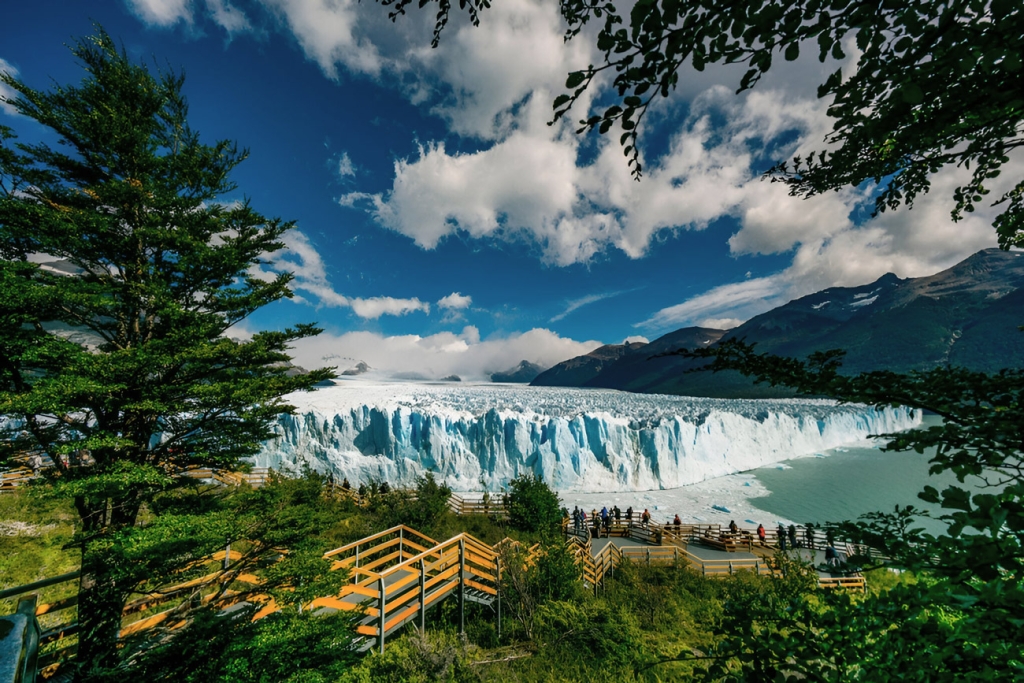Finalizado el Minitrekking en Perito Moreno, regresarán al refugio caminando por un sendero en el bosque donde se les entregará un souvenir. Luego, embarcarán nuevamente y harán una navegación frente a la pared sur del glaciar. Al llegar al Puerto Bajo de las Sombras, serán trasladados para visitar las pasarelas ubicadas en el frente del glaciar desde donde podrán tener una perspectiva diferente del paisaje al visitar los famosos balcones del Perito Moreno.